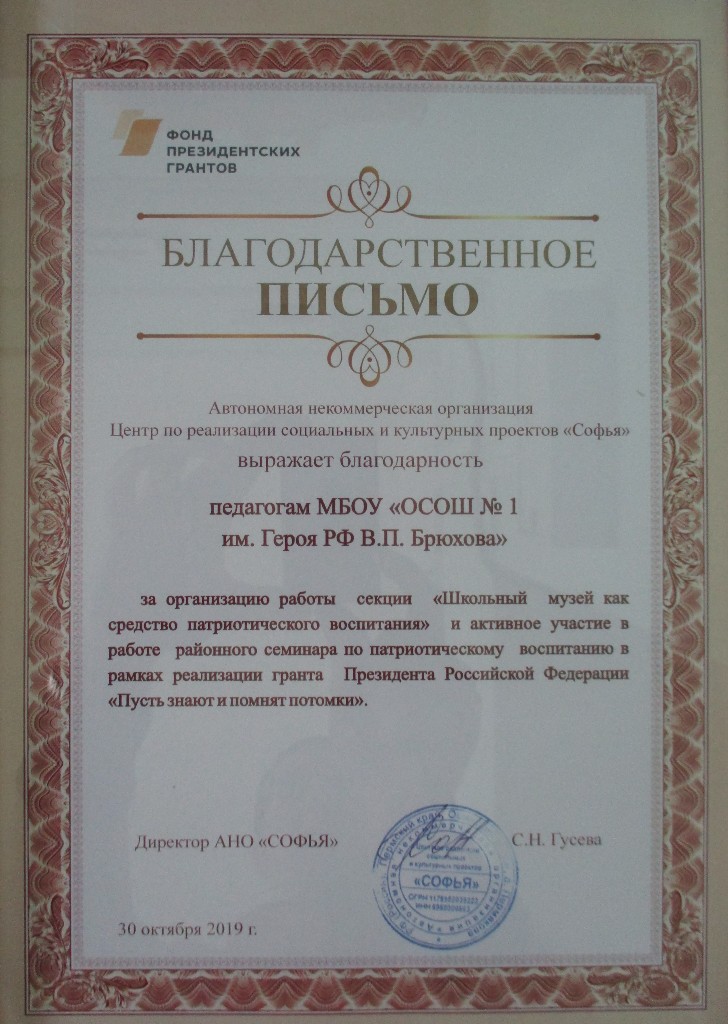 Благодарственное письмо Автономная некоммерческая организация "СОФЬЯ"