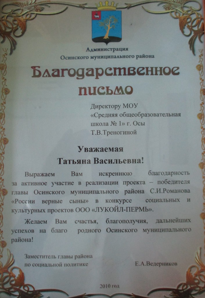 Благодарственное письмо Администрации Осинского муниципального района